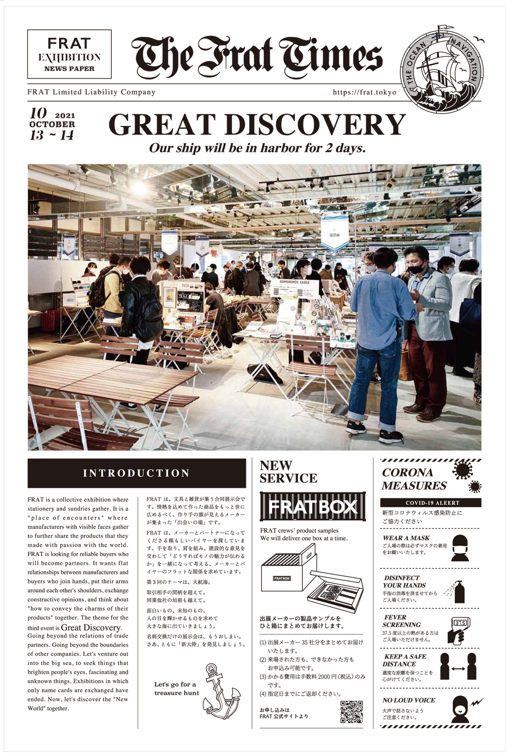 FRAT#3 来場予約はこちら 2020年は私達のまわりで、そして世界中で「つながり」が途絶えかけた一年でした。 メーカーと小売店をつないでいた手、小売店とお客さんをつないでいた声、文具や雑貨と人の心をつないでいた糸。 プツンと音を立てて、切れてしまうのではと不安に駆られる日々でした。 けれど、実際は切れてはいません。 この一年、できることに取り組み、考えを巡らせ、明日の希望を見失わなかったからです。 つながりが決して切れないことを証明するのは、他ならぬ私たち自身です。 その手を、声を、糸を、ふたたび太くできるのは自分たちしかいません。 私たちが ふたたびモノづくりを楽しみ、取引先やお客さんとコミュニケーションを育み、世界を1ミリでも明るくする。 文具・雑貨の展示会「FRAT #3」を、そんな場にしましょう。 Information 日時:2021年 10月13日(水)~10月14日(木) 13日:12:00~21:00 14日:10:00~17:00 会場:What Cafe(旧TMMT) 〒140−0002 東京都品川区東品川2-1-11 来場予約はこちら 出展ブランド一覧 あたぼうステーショナリー amorph(アモルフ) ありさ&あかめがね Beahouse dünn(ロンド工房) エモジ フレームウェア HARIO(ダイヤモンド) ハイモジモジ kamiterior/カミ