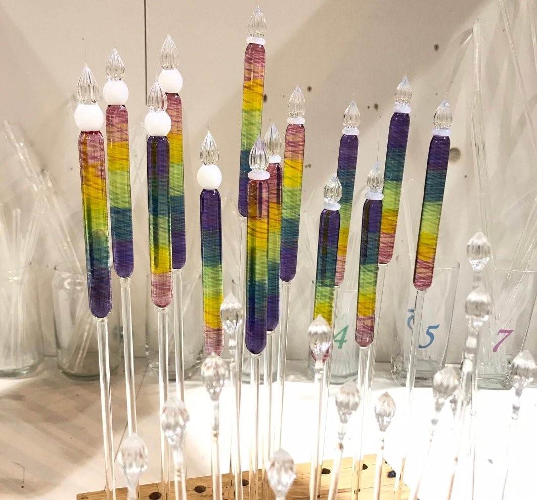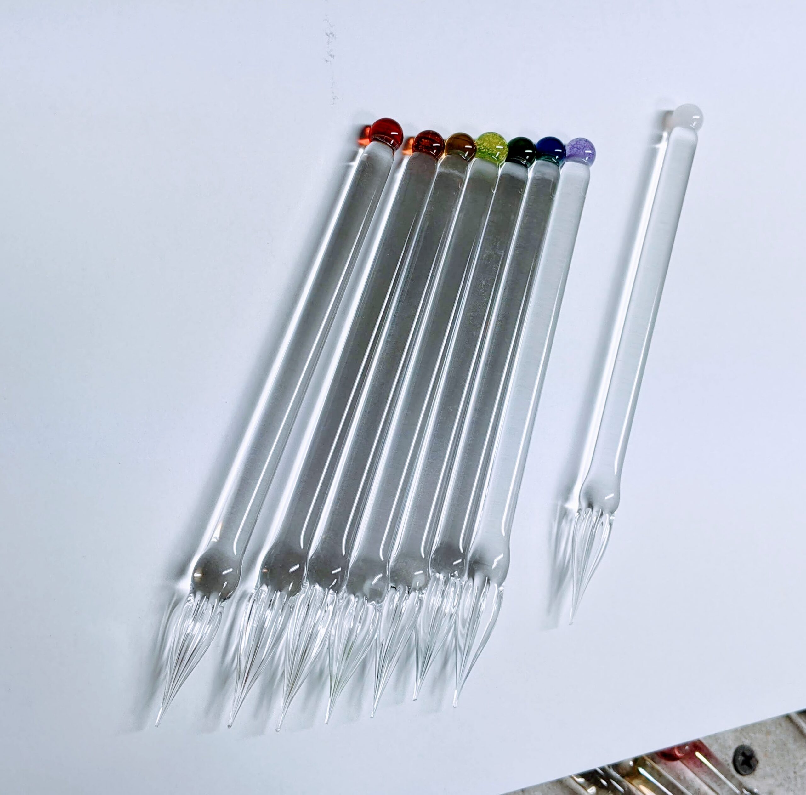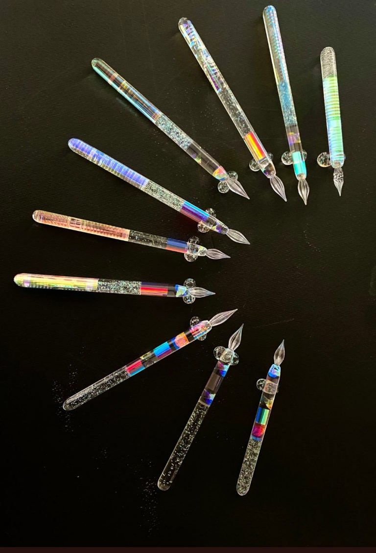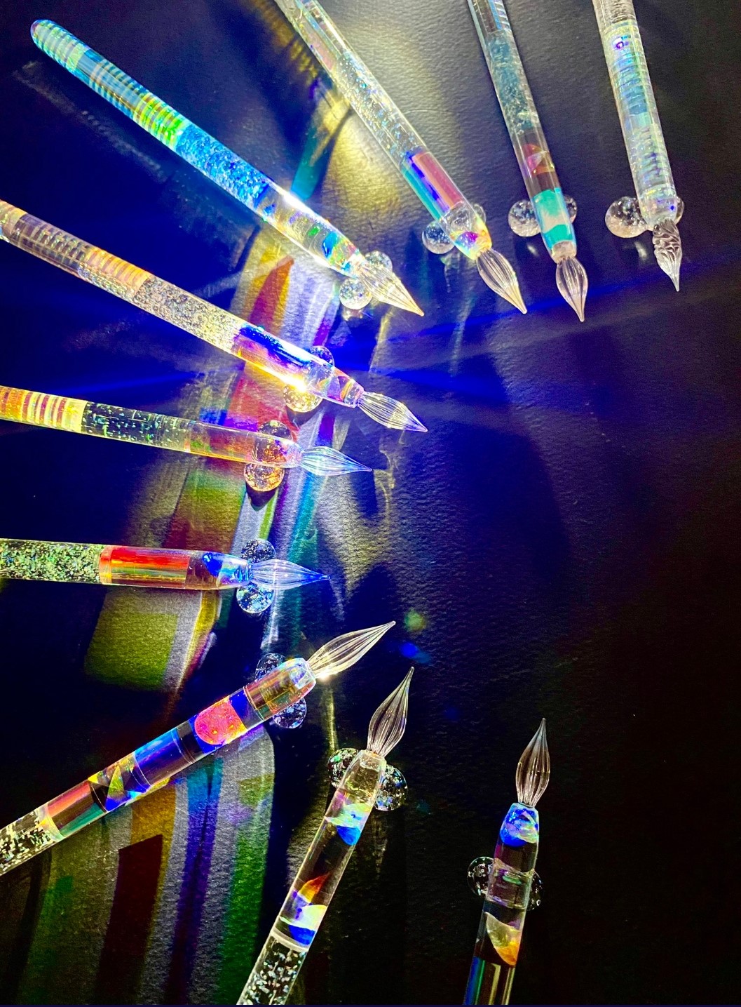 Reflection glass pen using dichroic glass (glass with a special film attached to its surface)