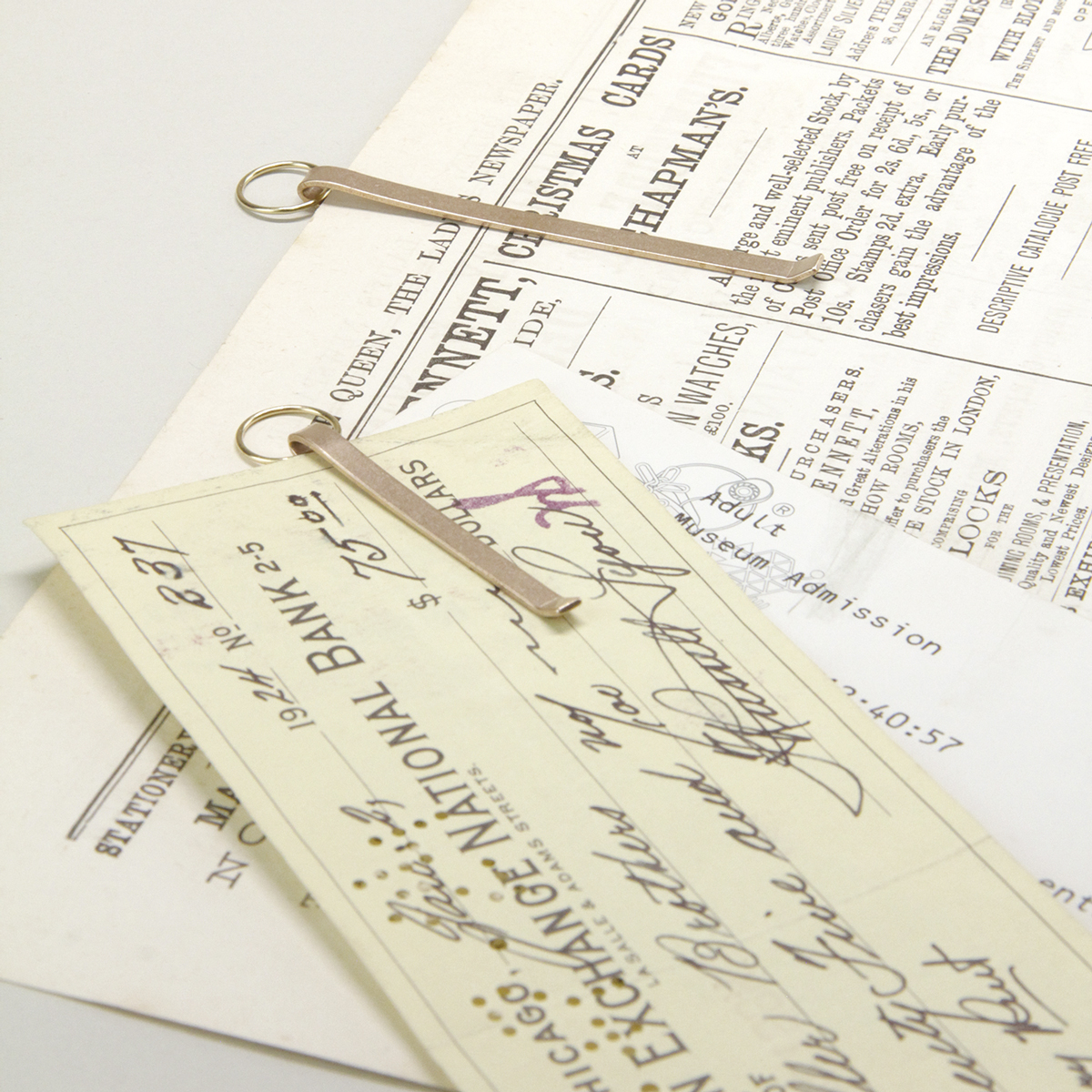 多目的に使用できるスティック形状のシンプルなクリップです。マネークリップ、メモクリップ、レシートホルダー、メッセージホルダー、ドキュメントホルダー、スケジュール帳にメモどめしたり……リングが付属しておりますのでフック等に引っかけることもできます。銅の美しい質感とクリップとして大切な機能であるバネ性にも優れたリン青銅を使用しているため柔らかく挟みやすく取り外しもスムーズに行えます。L サイズはA5 サイズのノートようにある程度重さがあるものでもしっかりとぶら下げることができます。リングは取り外し可能です。用途や自分のスタイルで自由にお選び頂けます。