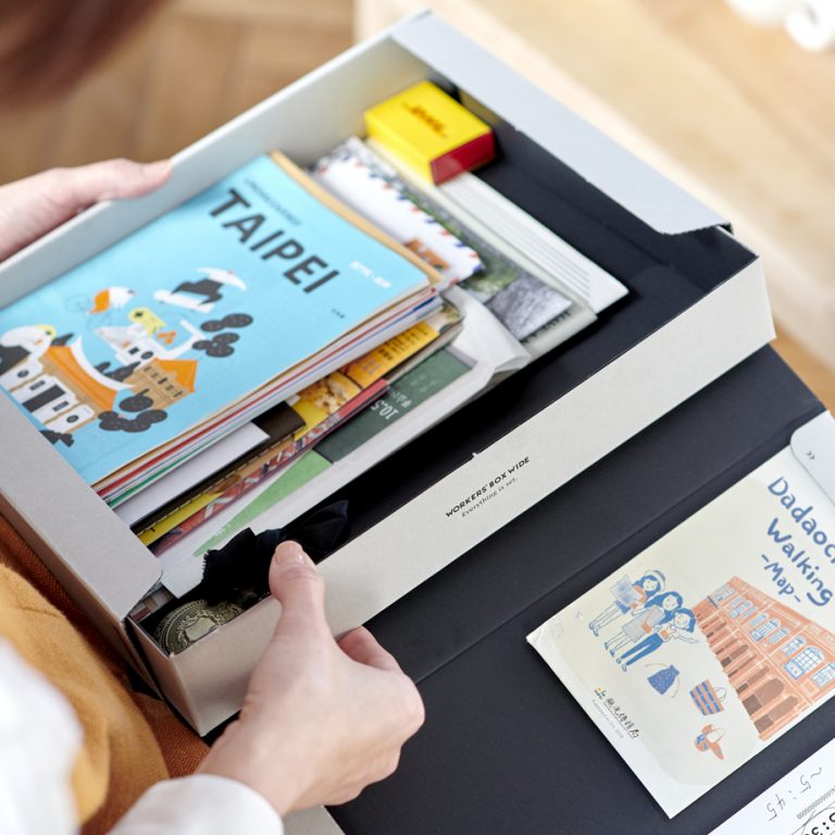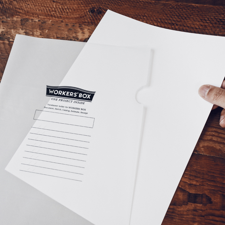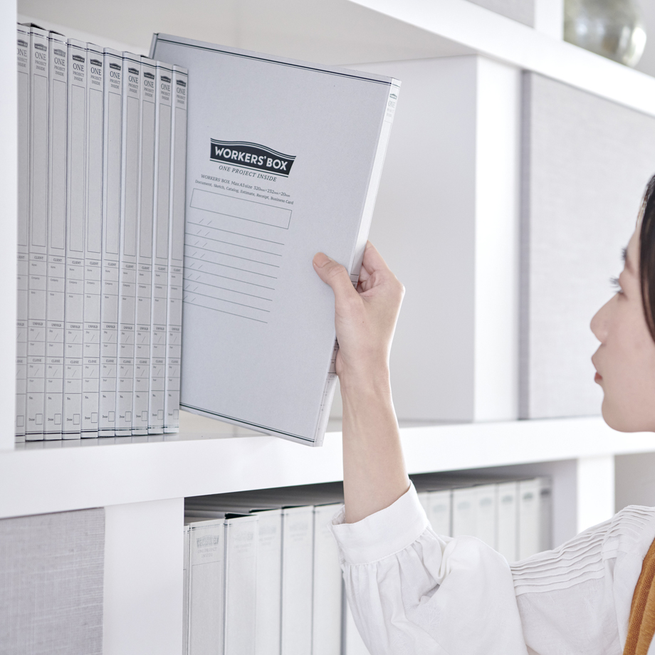 "With over 150,000 units sold, WORKERS'BOX is a tool designed to simplify your desk organization by letting you throw in project-related documents of various sizes, helping you concentrate on your work. The lineup includes the wide type "WIDE," the self-standing "STAND" for organizing multiple boxes, the original envelope "ENVELOPE," and the new tracing paper clear holder "HOLDER." We also offer POP UP displays and OEM consultation."
