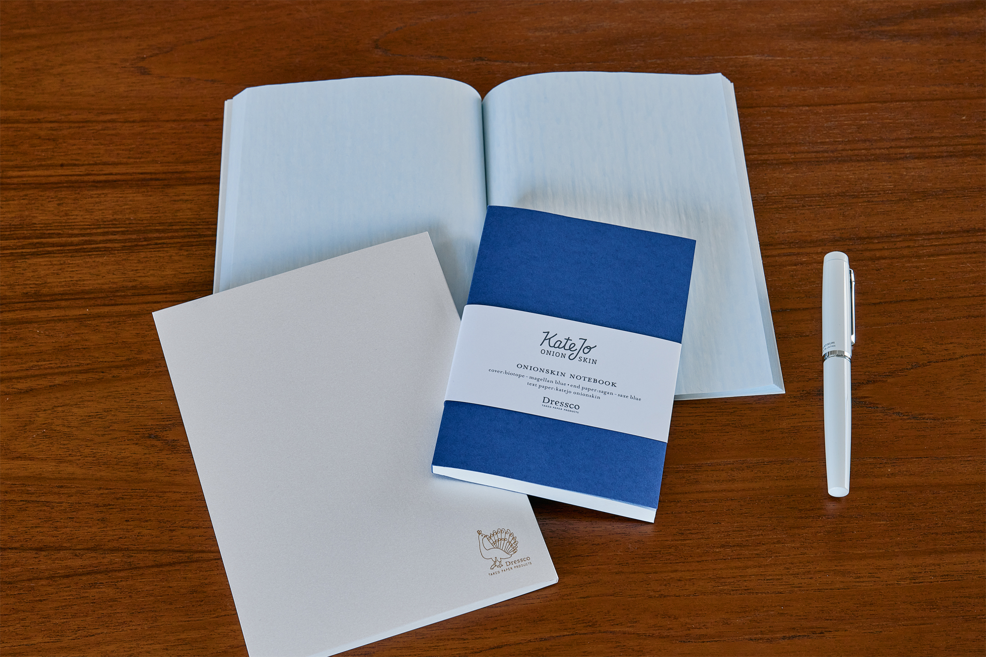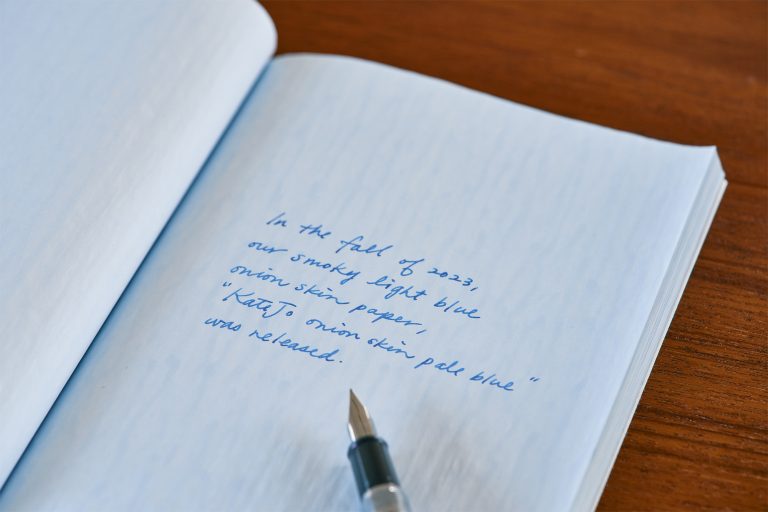 Onionskin paper was once widely used for handwriting and with typewriters to provide a lighter weight and more affordable alternative when sending air mail. In the modern era, airmail became less important and onion skin paper became relatively obscure. All manufacturing of onion skin paper in Japan was discontinued in 2010. To respond to the desires of fountain pen users, Takeo closely collaborated with a leading paper manufacturer to develop our original “KateJo” onion skin paper in 2020. In the fall of 2023, we developed smoky light blue colored onion skin paper, “KateJo onion skin pale blue”.