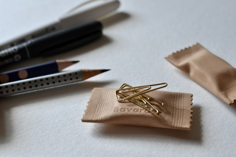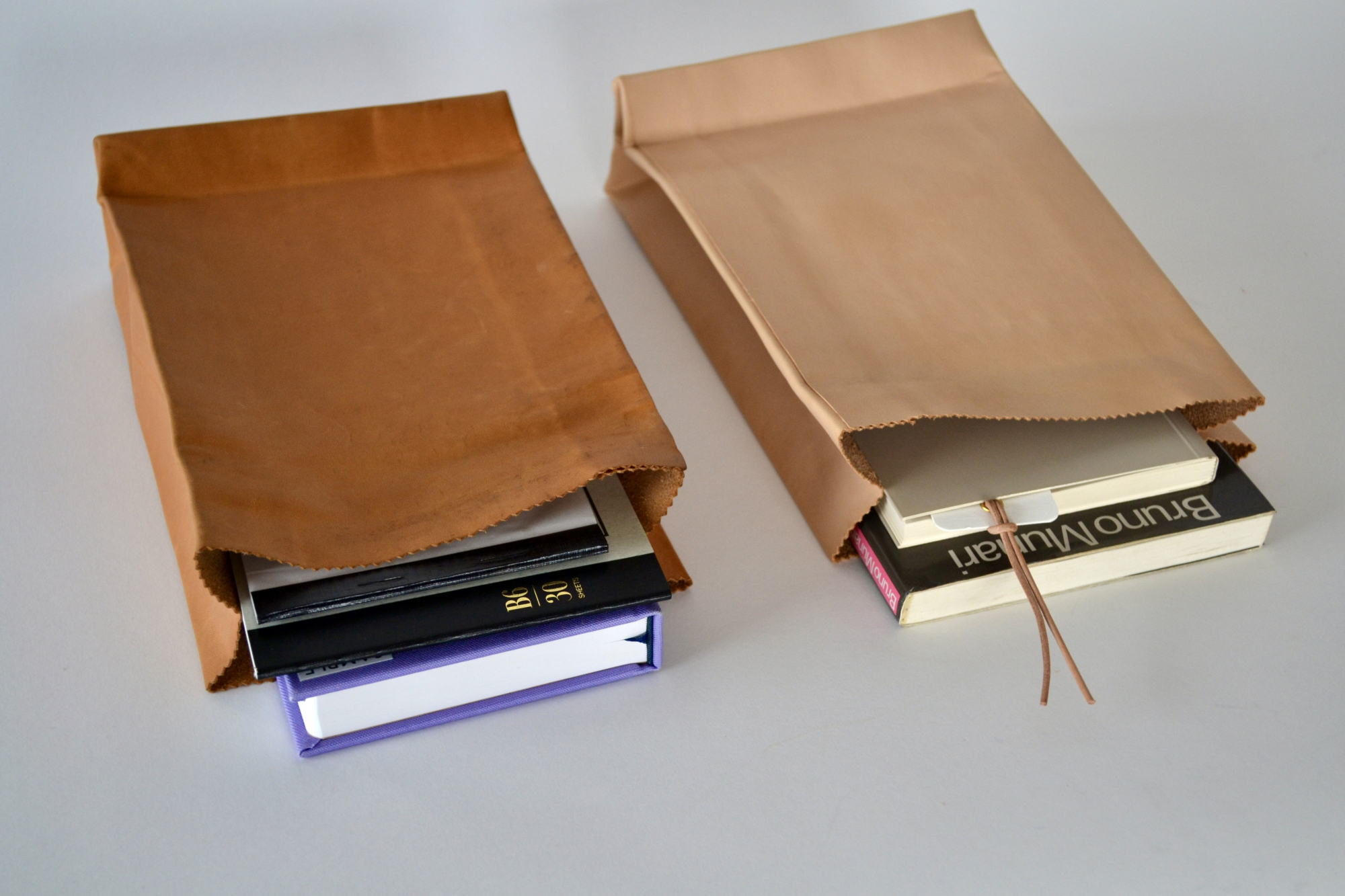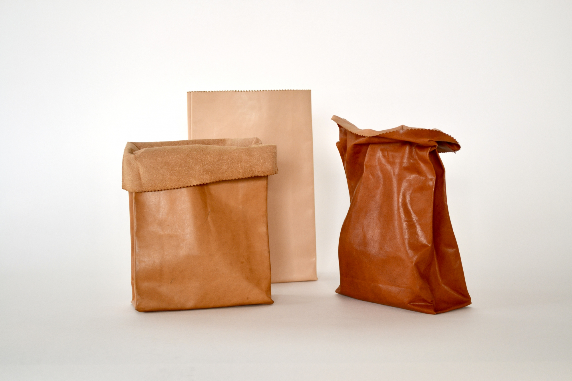 Its thinness and stiffness, reminiscent of a real paper bag, become softer and more supple with use, gradually changing to an amber colour and approaching the natural texture of leather.