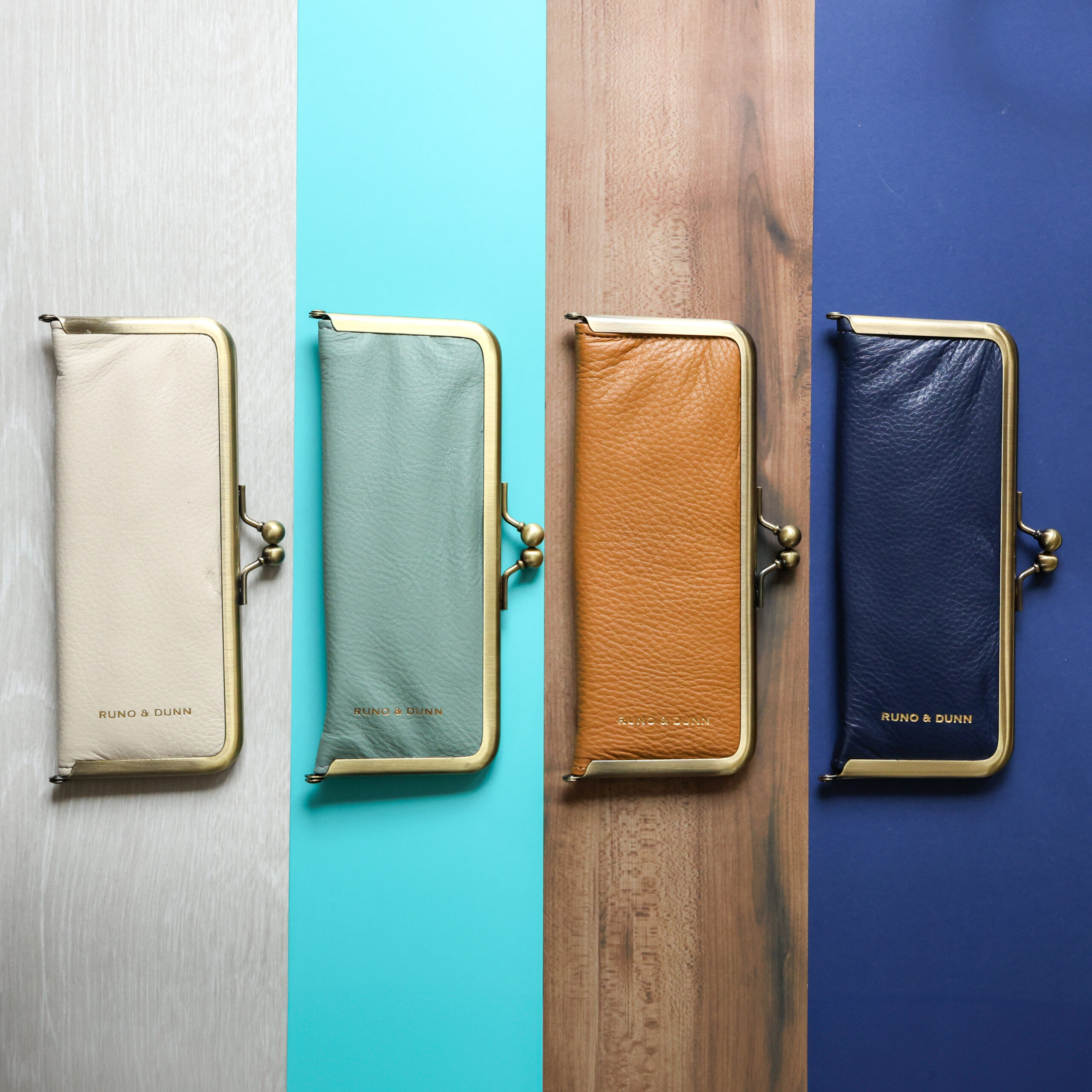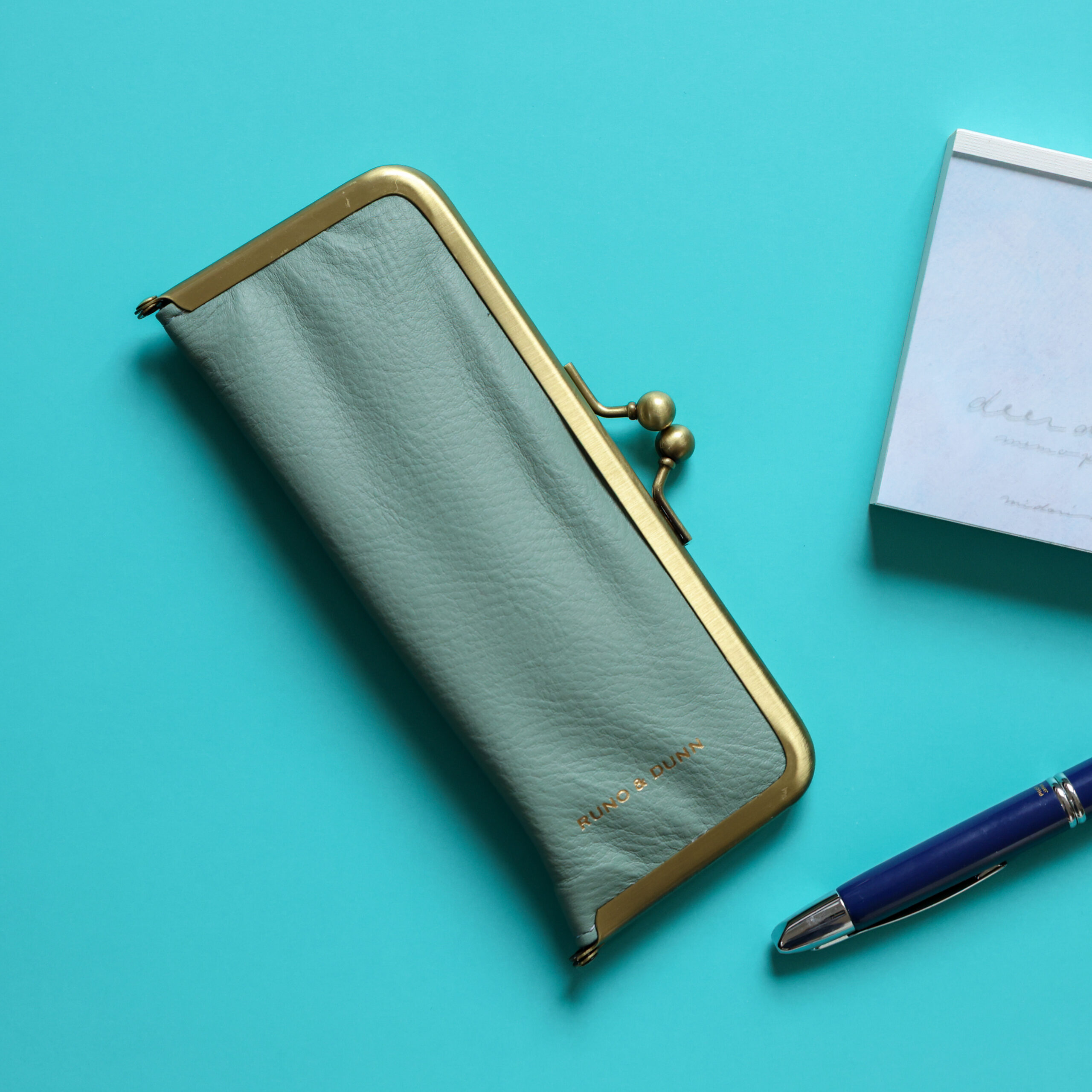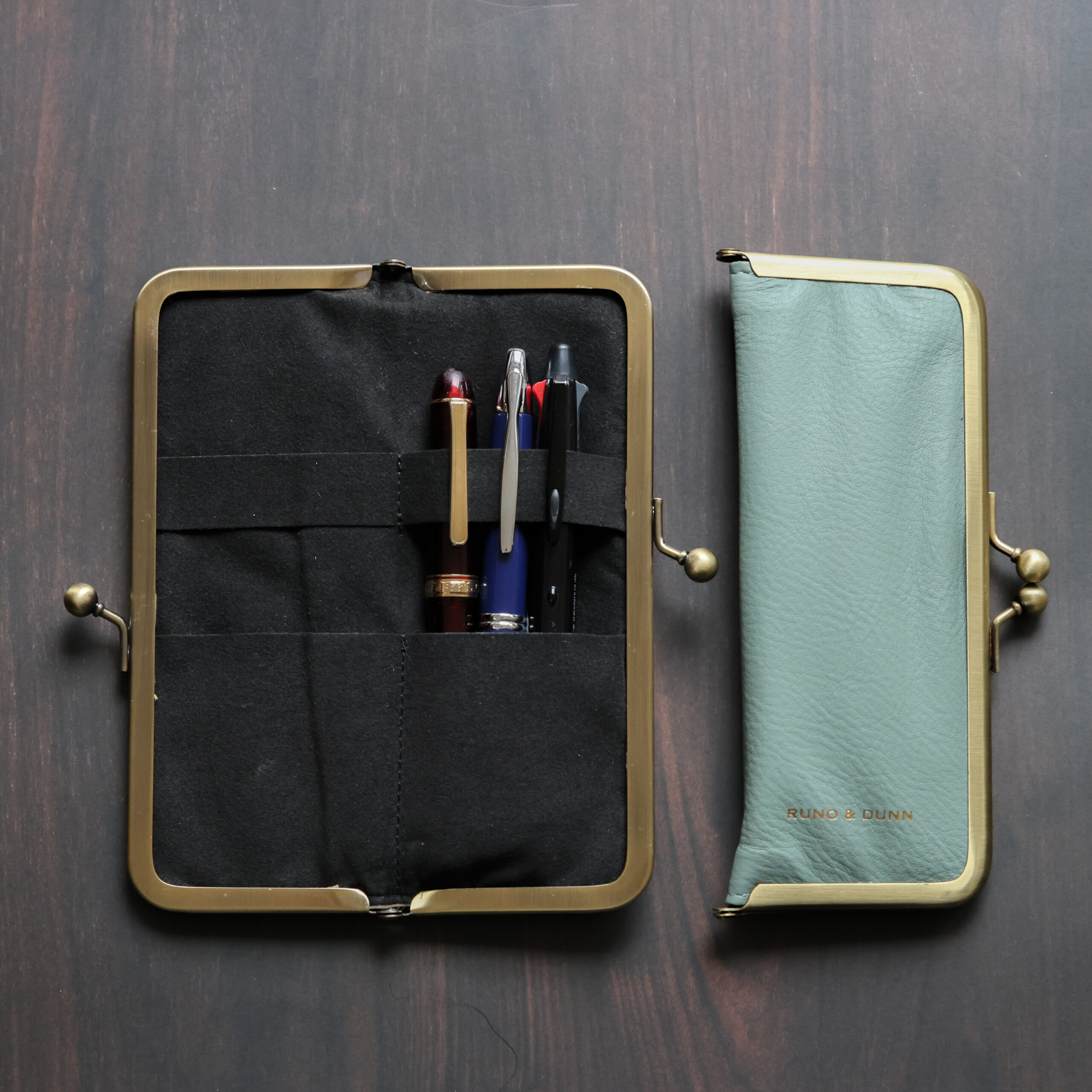 dünnとがま口ペンケース"るぅの"のコラボペンケースが新登場。がま口のかわいさと、革の高級感が絶妙なバランスで、大人のペンケースの装いを演出しています。外側はdünn glasspen boxでも使用したシボありの風合いの良い姫路レザー、ペンが入る内部は保管性の高い素材エクセーヌを使用し、ペンにも優しい仕様となっています。ペンだけではなく便箋や定規なども収納することが可能です。2025新色「ダスティミント」が登場。