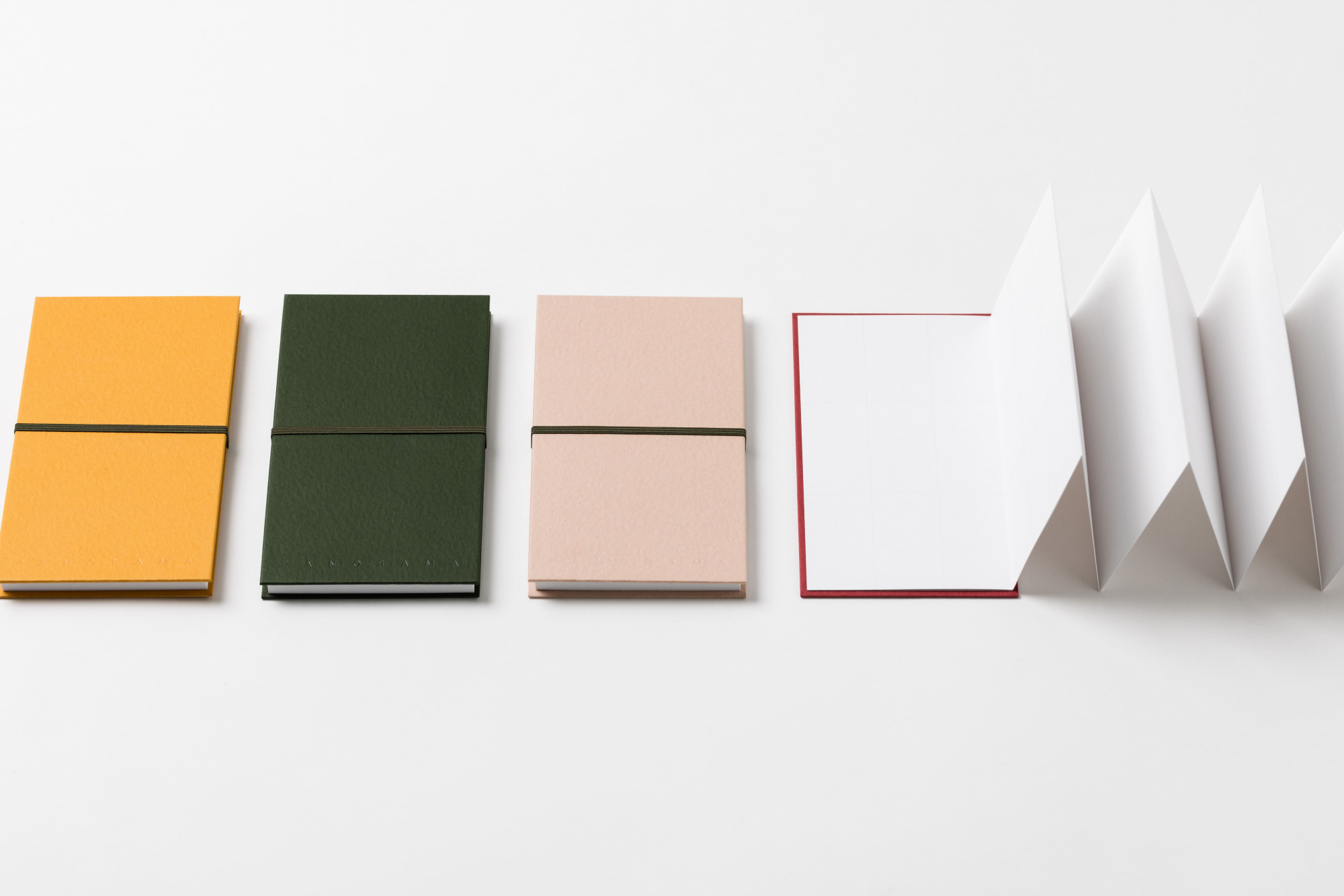 御朱印帳の技術を使い、丁寧に1枚ずつ刷毛で貼り合わせたアコーディオンタイプのノート。1ページにじっくり書き込むこともページを跨いで大きく描くこともでき、広げて俯瞰的に確認することもできます。スケッチや、旅行の時にスクラップに使うこともできます。スケッチしたり、書き込んだ情報をどんどん展開できたり、アイデアを途切れさせずに考えるのにも適しています。本文には原稿用紙にも使われる紙を使用。携帯しやすいサイズで持ち運びにも適しています。