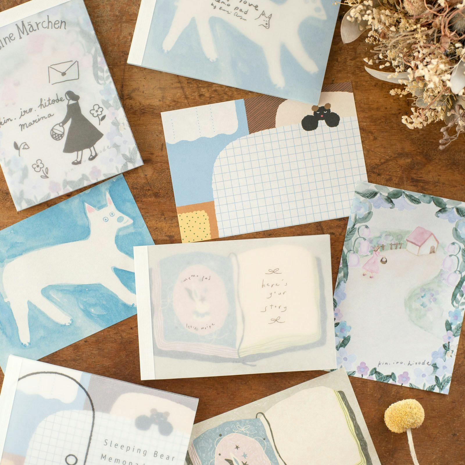 用紙には包装紙でよく使われる"純白ロール”を使用。表面はザラザラ、裏面はツルツルとした風合いが特徴です。クリエイターによるカラフルで愛らしいイラストがプリントされており、グラシン紙の表紙から透けて見えるのも楽しいポイント。一筆箋としてもちょうどいいサイズで、ちょっとしたメッセージを添えるときにも活躍します。