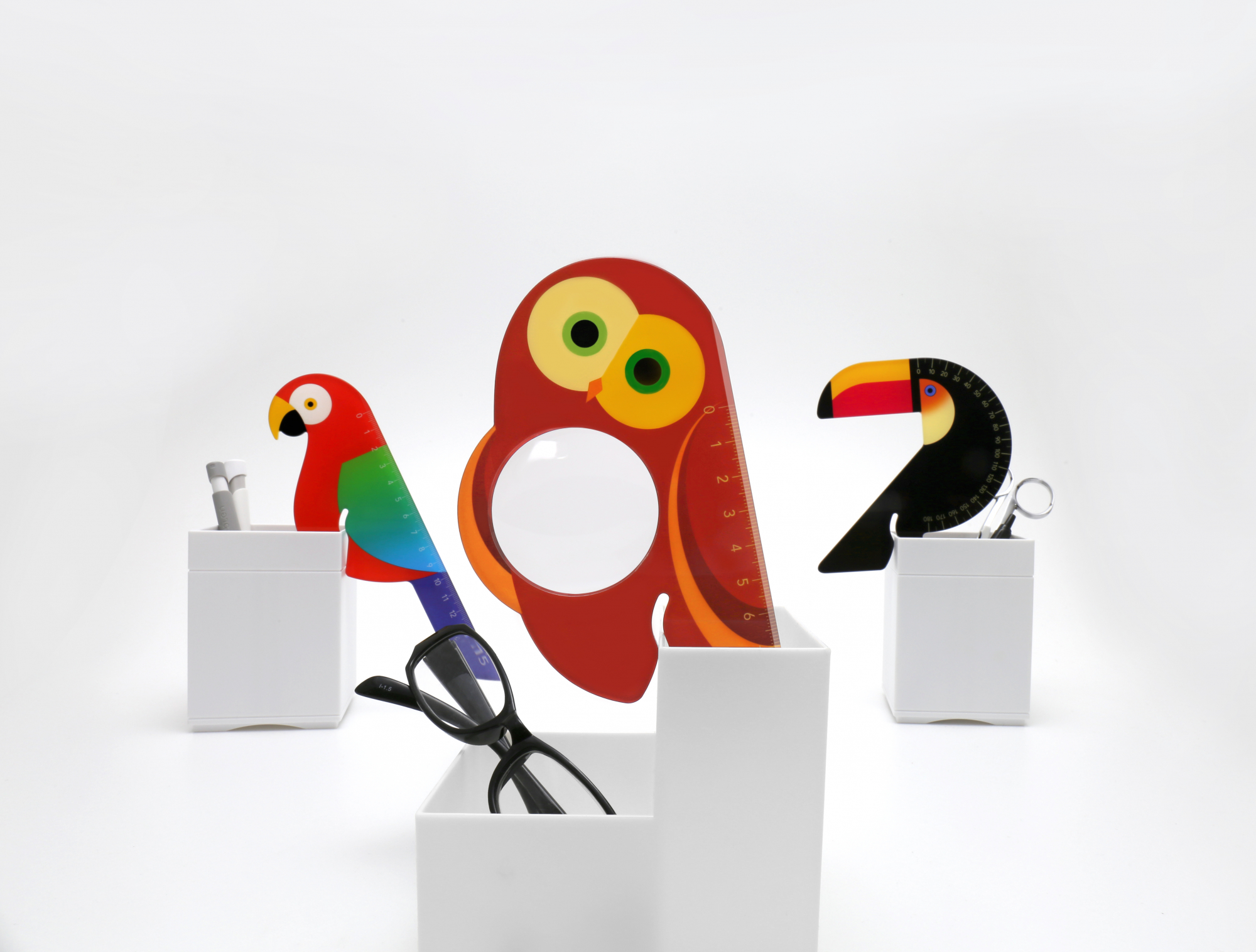 Three types available: parrot ruler, toucan protractor, and owl magnifying glass.