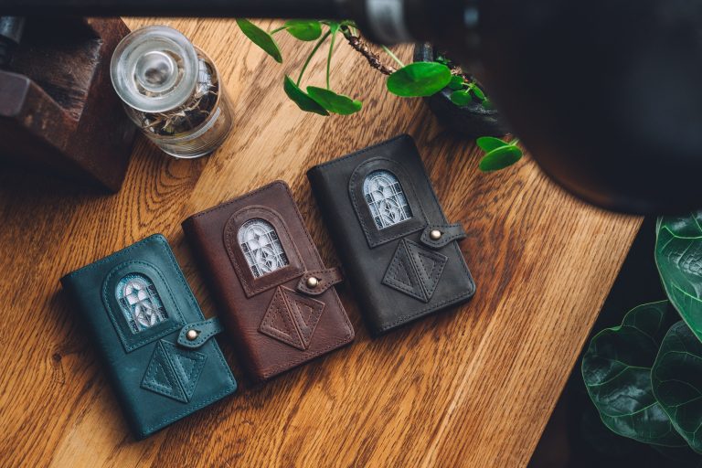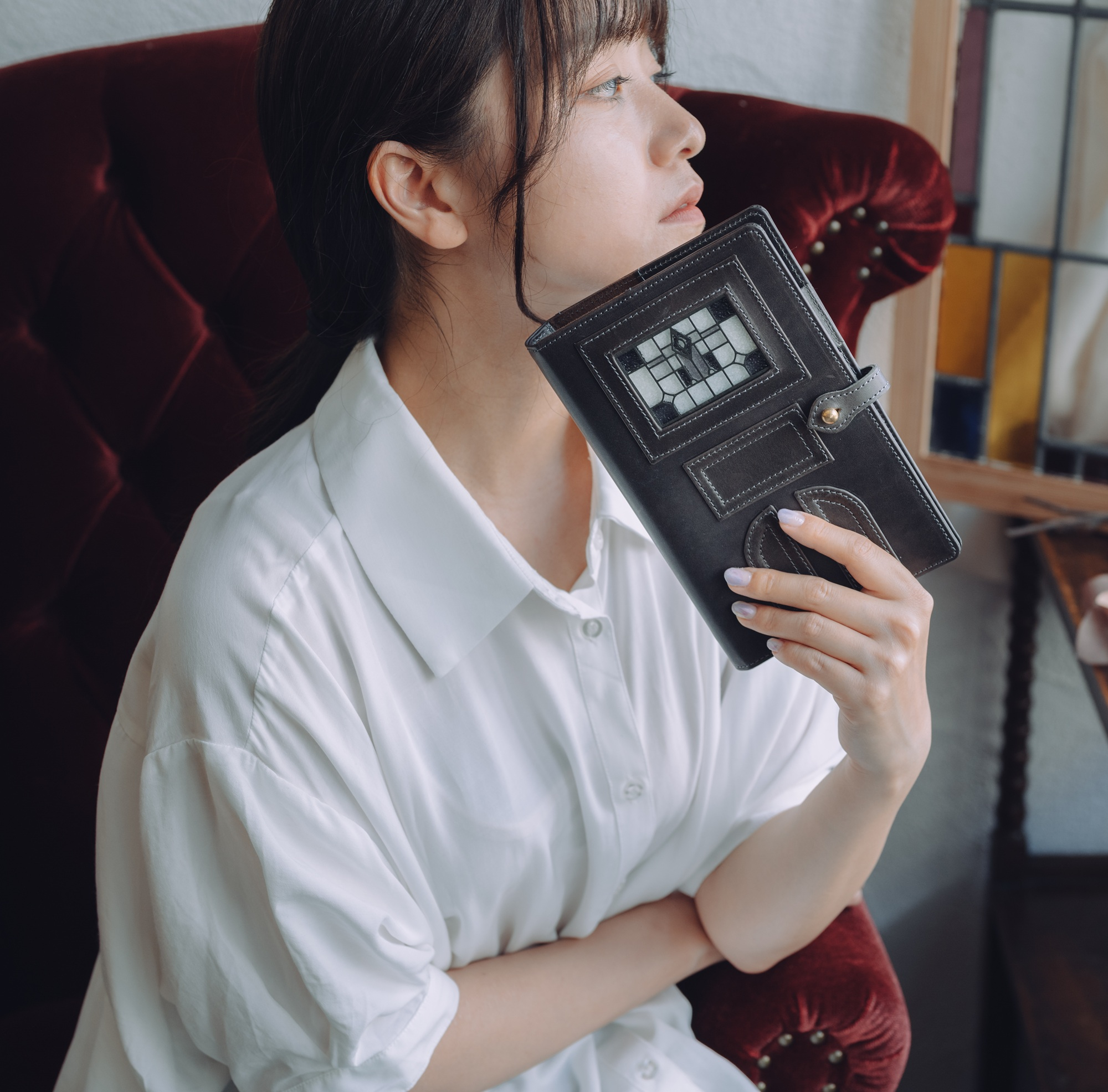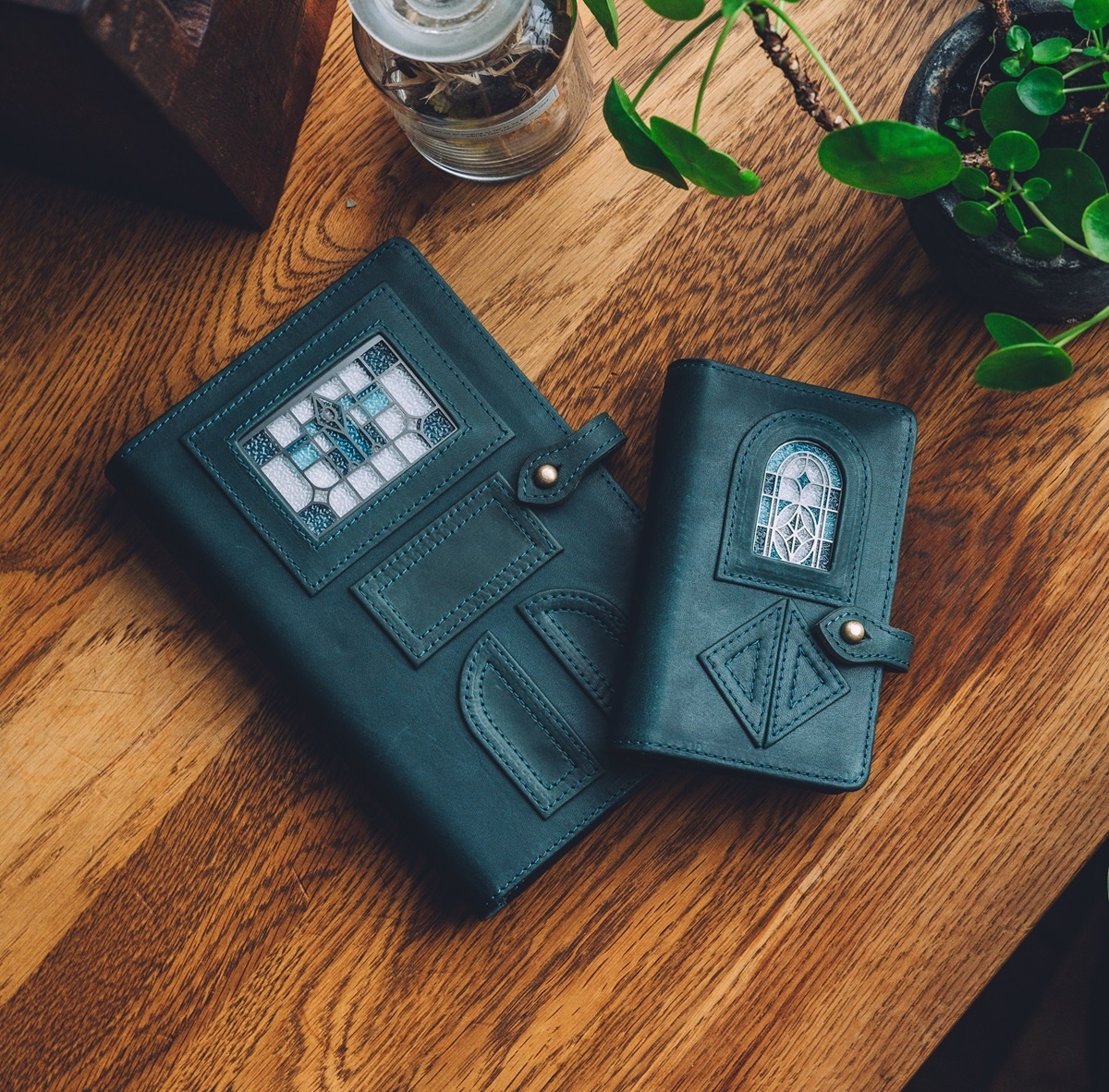 リアルガラスと革を融合させた、ステンドグラスドアデザインの革小物。