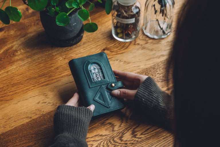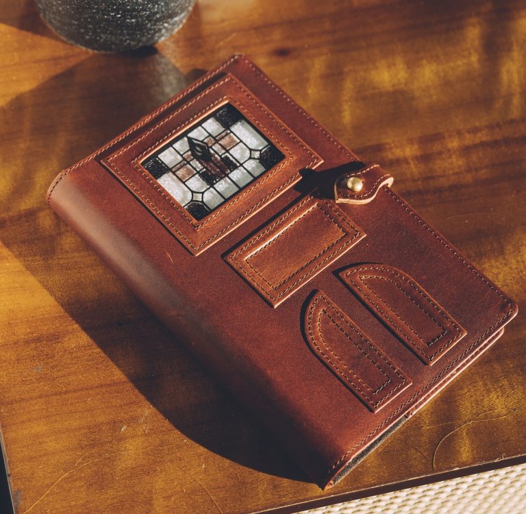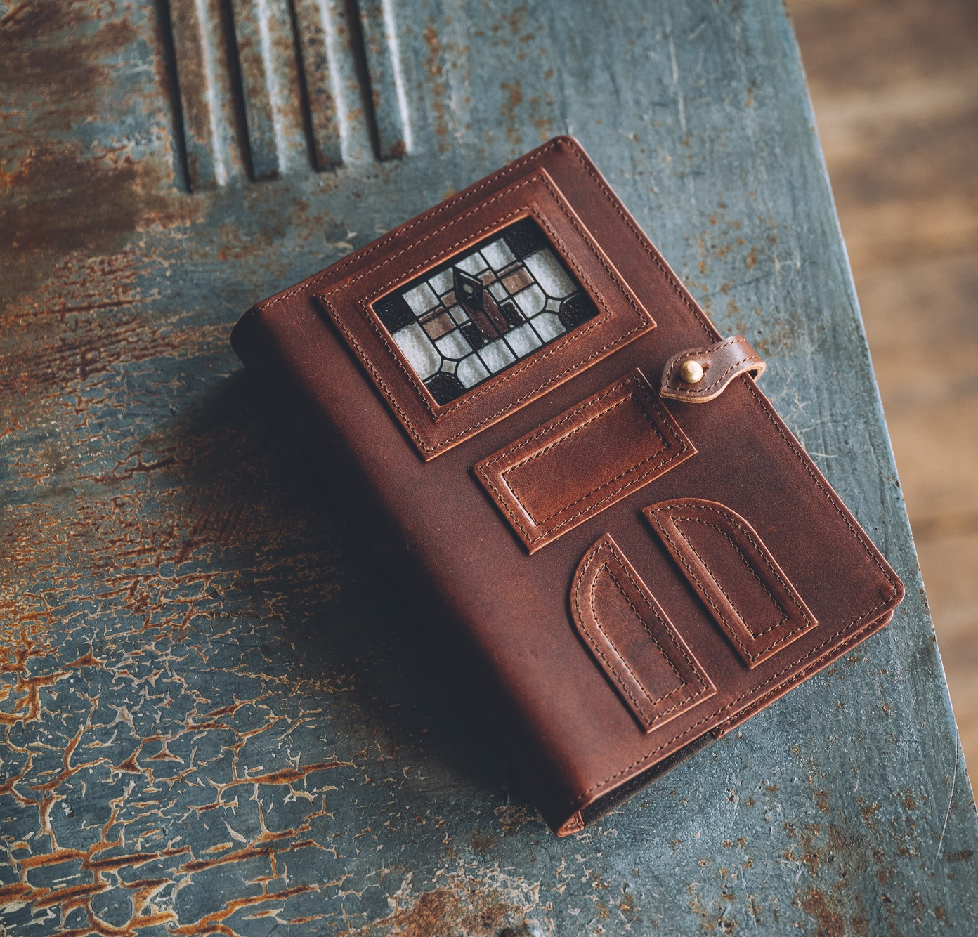 A leather accessory that blends real glass and leather, featuring a stained glass door design.